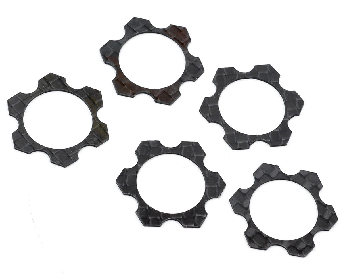 This is a pack of five Avid 1/8th Carbon 0.5mm Track Width Spacers. The Avid 8th Hex Track Width Spacers (17mm) are a great way to adjust the width on any 8th scale buggy or truggy without having to change out your hubs. Typically this will help stabilize a vehicle by increasing track width and scrub.