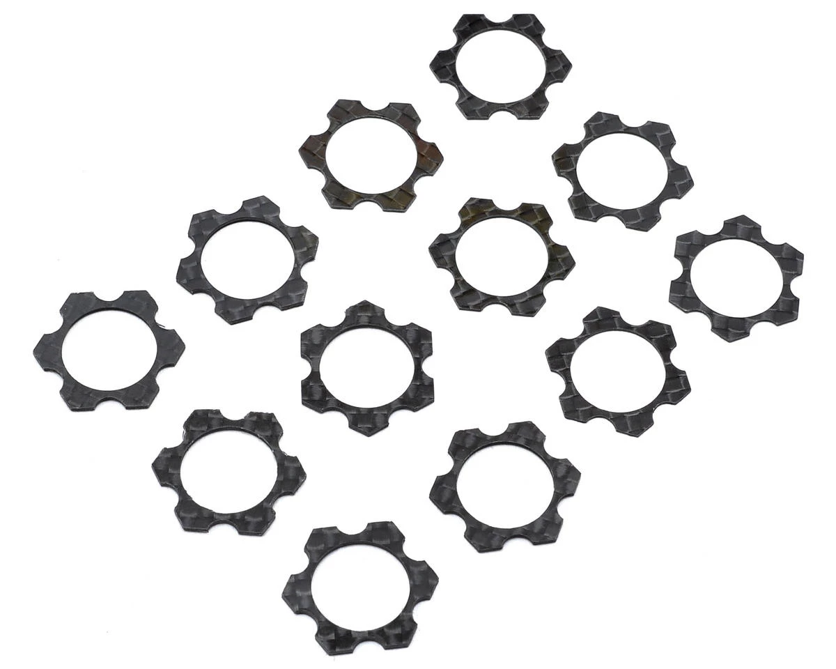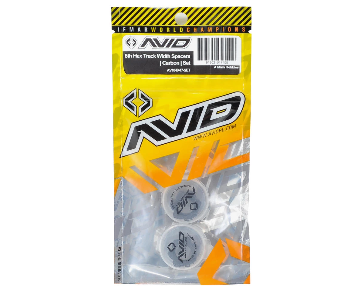 This is an Avid 1/8th Carbon Track Width Spacer Set. The Avid 8th Hex Track Width Spacers (17mm) are a great way to adjust the width on any 8th scale buggy or truggy without having to change out your hubs. Typically this will help stabilize a vehicle by increasing track width and scrub.