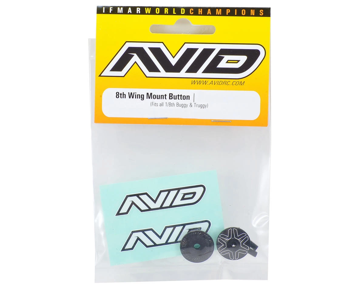 This is a pack of two optional Avid RC 1/8th Wing Mount Buttons. Avid RC Wing Mount Buttons are designed with an aerodynamic profile to avoid upsetting airflow to the rear spoiler, and most importantly, the under-side has serrated grippers to help keep your wing secure. The serrated bottom also prevents the button from twisting your new wing wrap causing the lamination to separate from the decal layer.