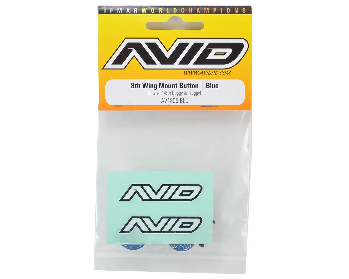 This is a pack of two optional Avid RC 1/8th Wing Mount Buttons. Avid RC Wing Mount Buttons are designed with an aerodynamic profile to avoid upsetting airflow to the rear spoiler, and most importantly, the under-side has serrated grippers to help keep your wing secure. The serrated bottom also prevents the button from twisting your new wing wrap causing the lamination to separate from the decal layer.