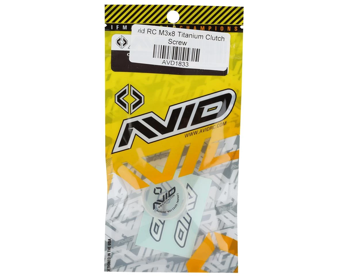 Avid RC 3x8mm Titanium Clutch Screw. This optional clutch screw is made from high quality 6AL-4V Titanium. The flanged surfaces helps keep fuel and debris from entering the clutch bearings. This screw can be installed or removed using either a 5.5mm socket driver or 2.5mm Allen wrench. Package includes one clutch nut.