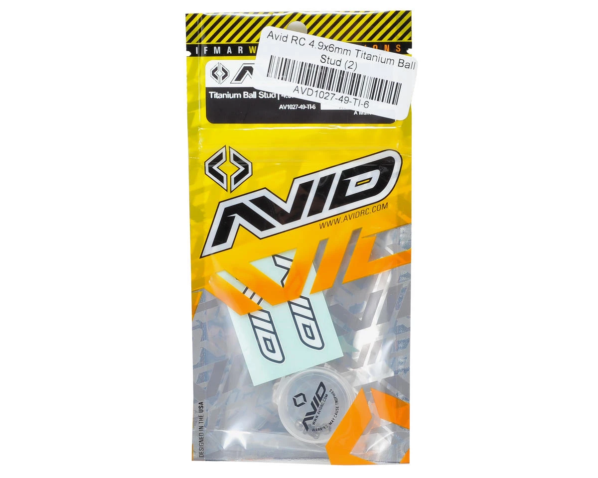 - Each package includes (2) 4.9x6mm Titanium Ball Studs, and 1 AVID mini decal sheet.