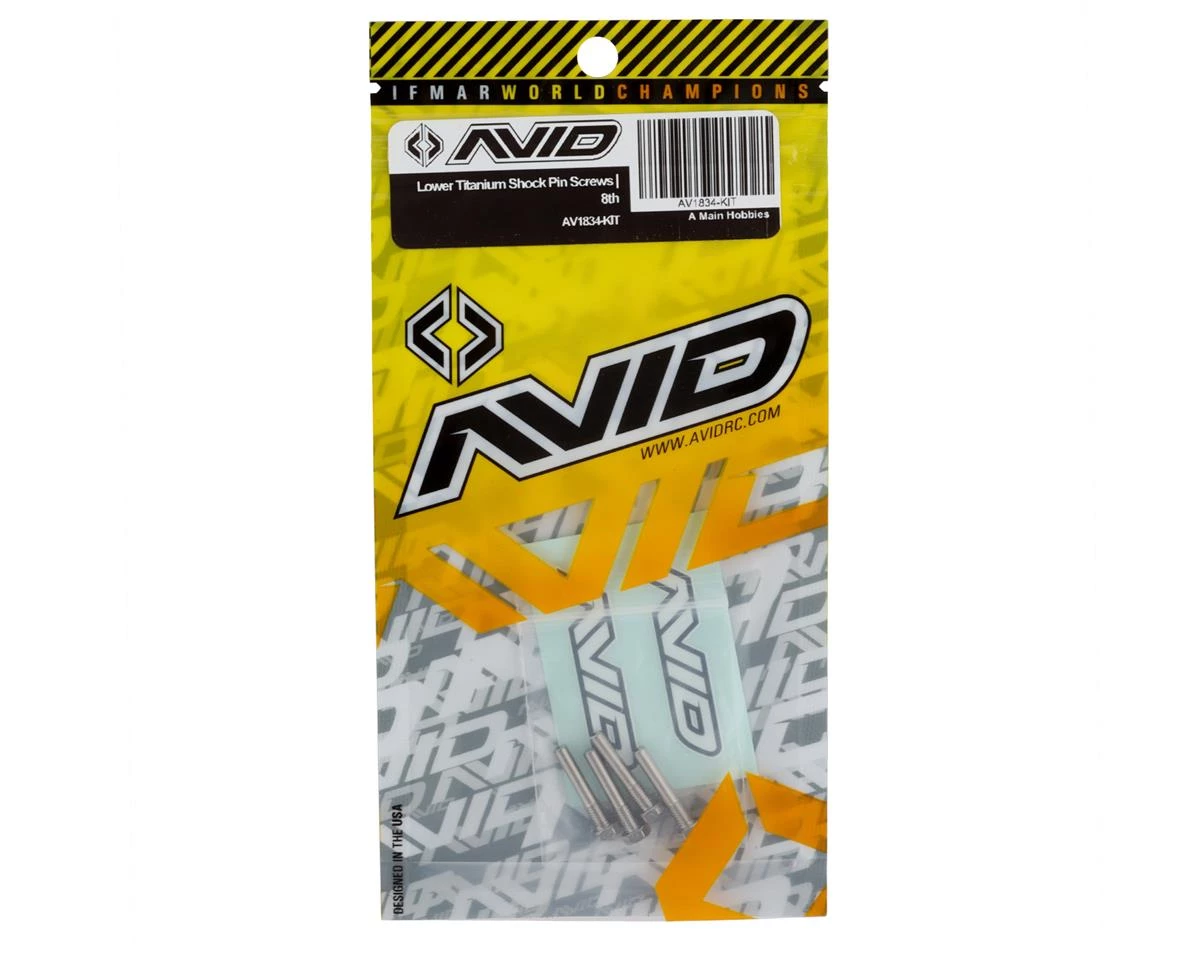 The Avid RC Associated 1/8 Lower Titanium Shock Pin Screws are designed with a threaded base eliminating the worry of forgetting to tighten your shock pin set screws. Made from high quality machined 6Al-4V titanium these pins offer superior strength at a fraction of the weight. Machined with left and right handed threads this set comes with two left side and two right side pins to cover all four shocks on your car. The head of these pins features a 5.5mm head making it a common size and they are also engraved with a thread rotation indicator along with a center-drilled hole for easy docking of your calipers while measuring your shock lengths. With high quality materials and every design detail scrutinized these titanium shock pins are the high performance product you expect from a brand like Avid RC.