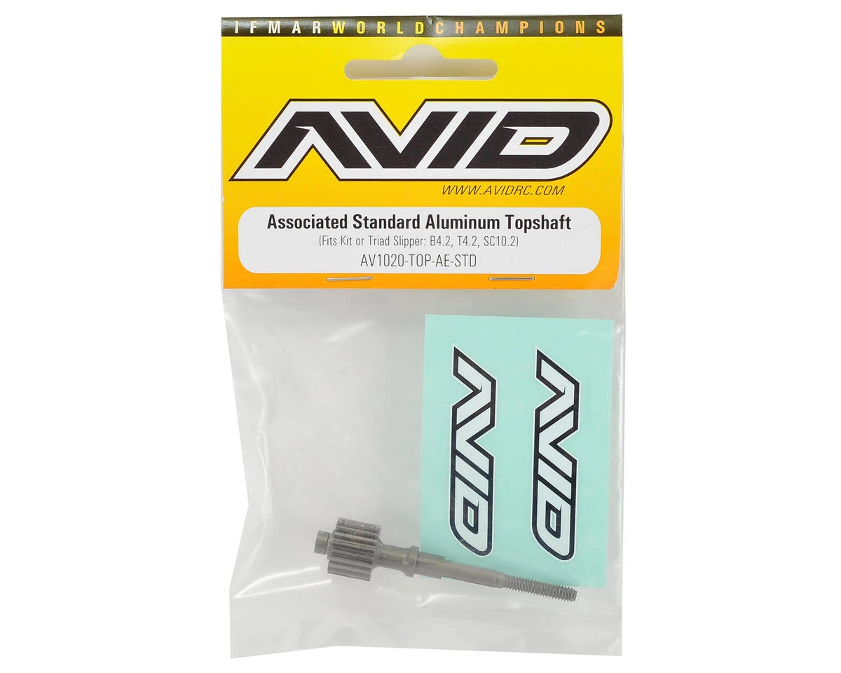 This is an optional Avid RC Associated Standard Aluminum Topshaft. Associated owners can now take advantage of reduced rotating mass in any Associated vehicle that uses the ASC9601 topshaft. This top shaft delivers improved punch, faster acceleration and faster laps. Plus, the Avid topshaft weighs 4 grams, compared to the 10.7 grams of the stock part. Thats a 6.7g weight savings, making this drop in upgrade a great upgrade for stock class racers.