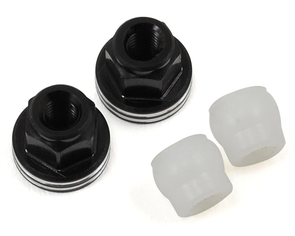 These standoffs are made of black anodized 7075 Aluminum and have a wide base to help prevent bent shock mount screws. The design utilizes the original floating AE mounting system with a smooth pivoting ball to provide seamless unrestricted motion. The Delrin pivot bushings can be replaced to help maintain a tight fit in your shock caps.
