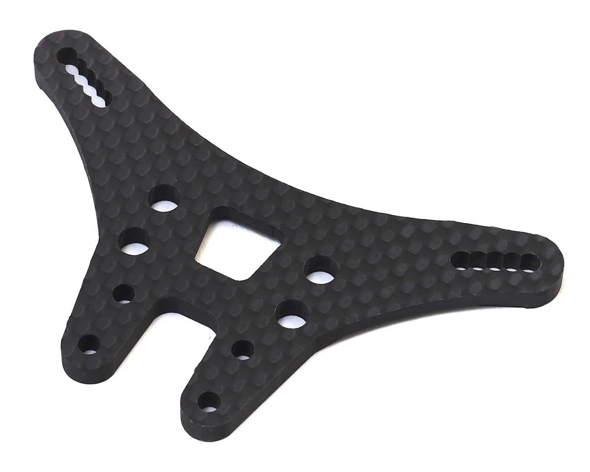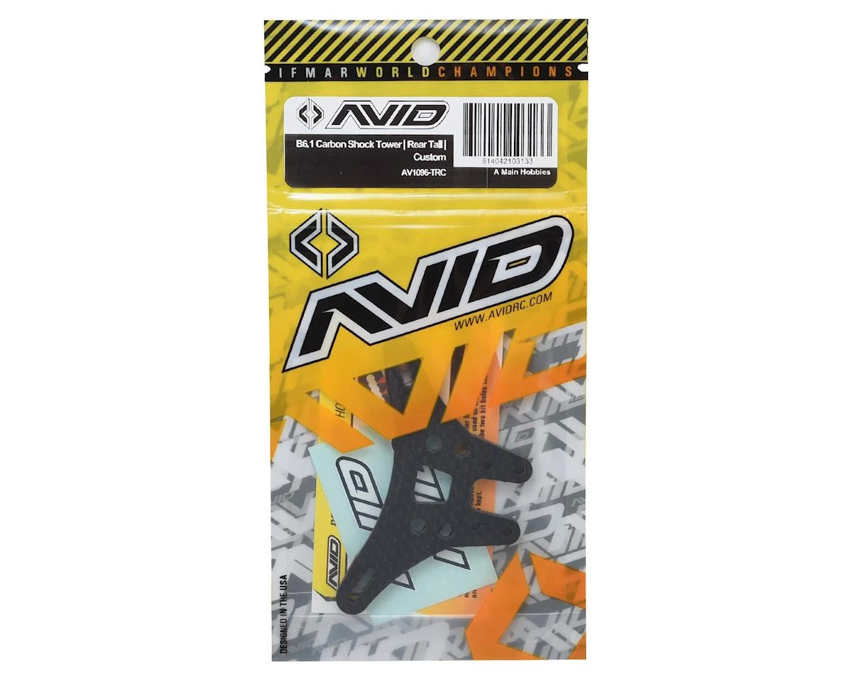 The Avid B6.1 Carbon “Tall” Rear Shock Tower is made from 100% carbon fiber and designed for strength. Avid calls this tower custom because they removed the outer kit hole since it was never used, added in-between holes for finer adjustments, and you may now go a half hole in further on the tower than the kit tower. Check the hole location file in the resources tab above.