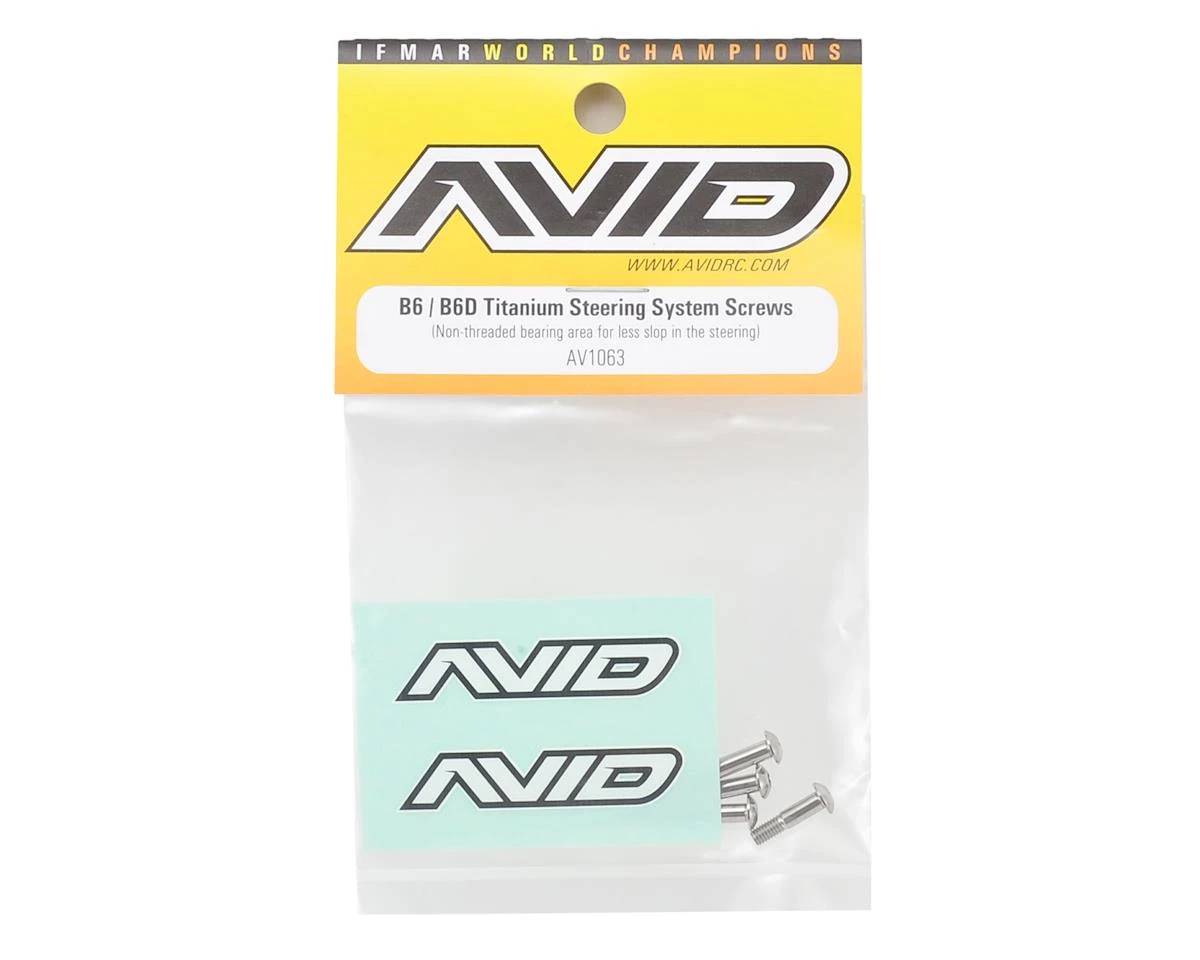 This optional Avid Titanium Steering System Screw Set features screws that are shouldered to remove the slop out of your steering rack while also dropping 3g. The stock kit screws measure in at 2.91mm; these Avid titanium shouldered screws come in at 2.99mm for a much tighter bearing fit.