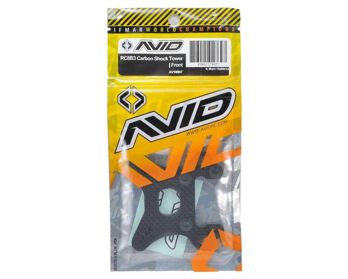This Avid RC RC8B3 Front Shock Tower is made from 5mm thick 100% carbon fiber and removes the shock standoff pockets found on the stock AE shock tower. Do so, and while using the Avid -1 Aluminum Standoffs (AVD1809-1), the shock tower/standoff package removes 33% of the weight from up high compared to stock – all while retaining the same shock location as the kit tower.