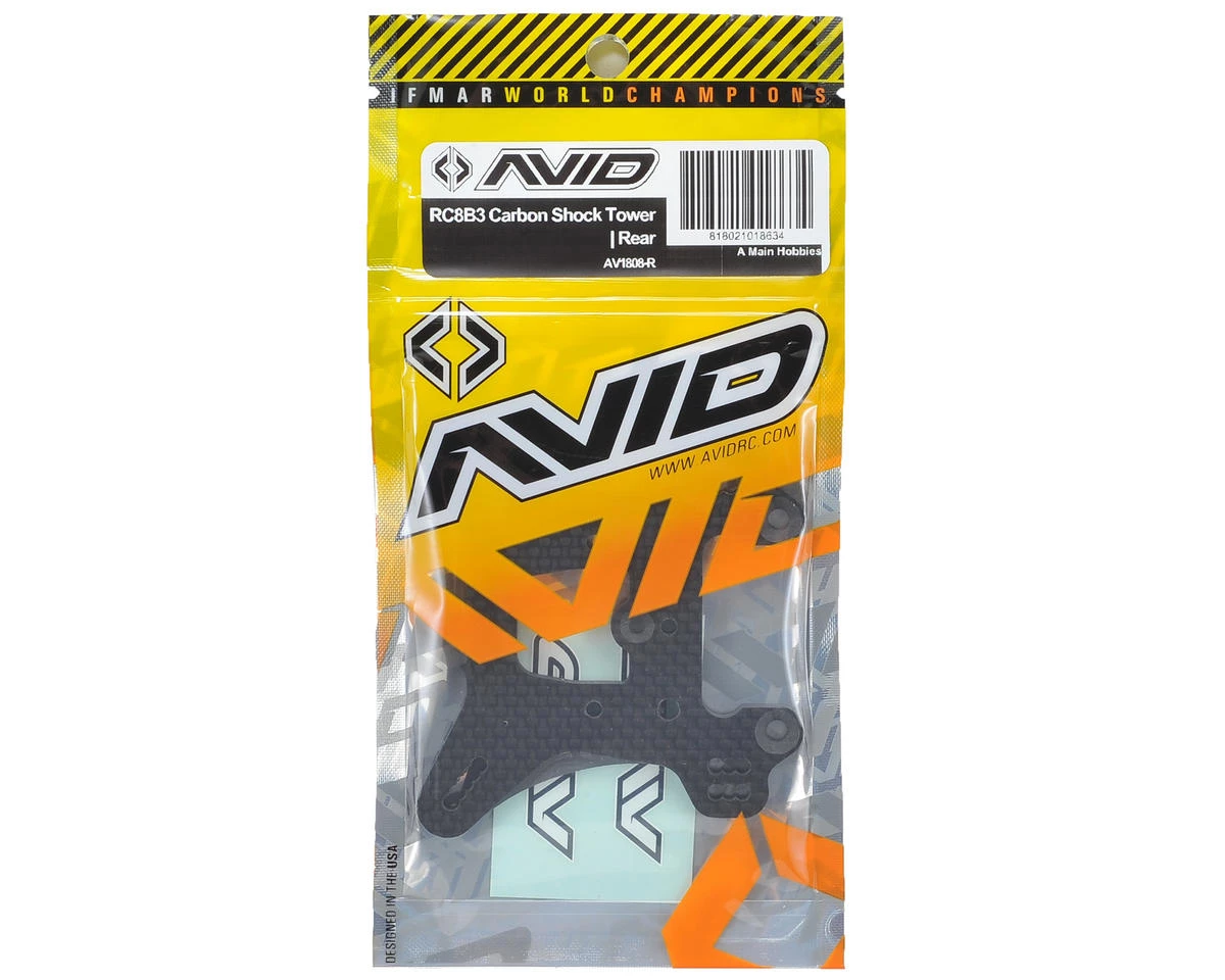 This Avid RC RC8B3 Rear Shock Tower is made from 4mm thick 100% carbon fiber and removes the shock standoff pockets found on the stock AE shock tower. Do so, and while using the Avid -1 Aluminum Standoffs (AVD1809-1), the shock tower/standoff package removes 40% of the weight from up high compared to stock – all while retaining the same shock location as the kit tower.