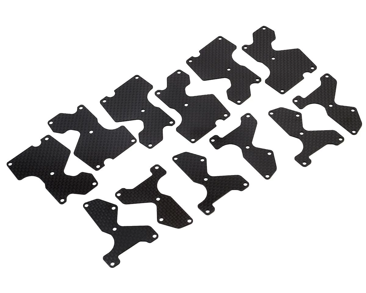 Mugen MBX8 Carbon Arm Inserts Set include all the front (0.8, 1.0, 1.2mm) and rear (0.8, 1.0, 1.2mm) inserts to offer your buggy another great tuning feature by reducing the flex and twist in the arm.