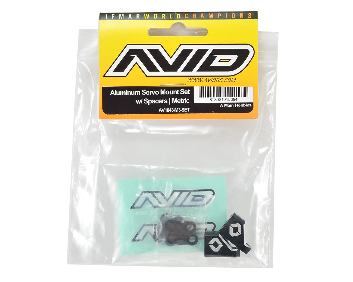 - Includes M3 Servo Mounts (pair), Carbon Fiber Servo Mount Spacers (2×1.5mm and 2×2.5mm), and 1 mini Avid decal.