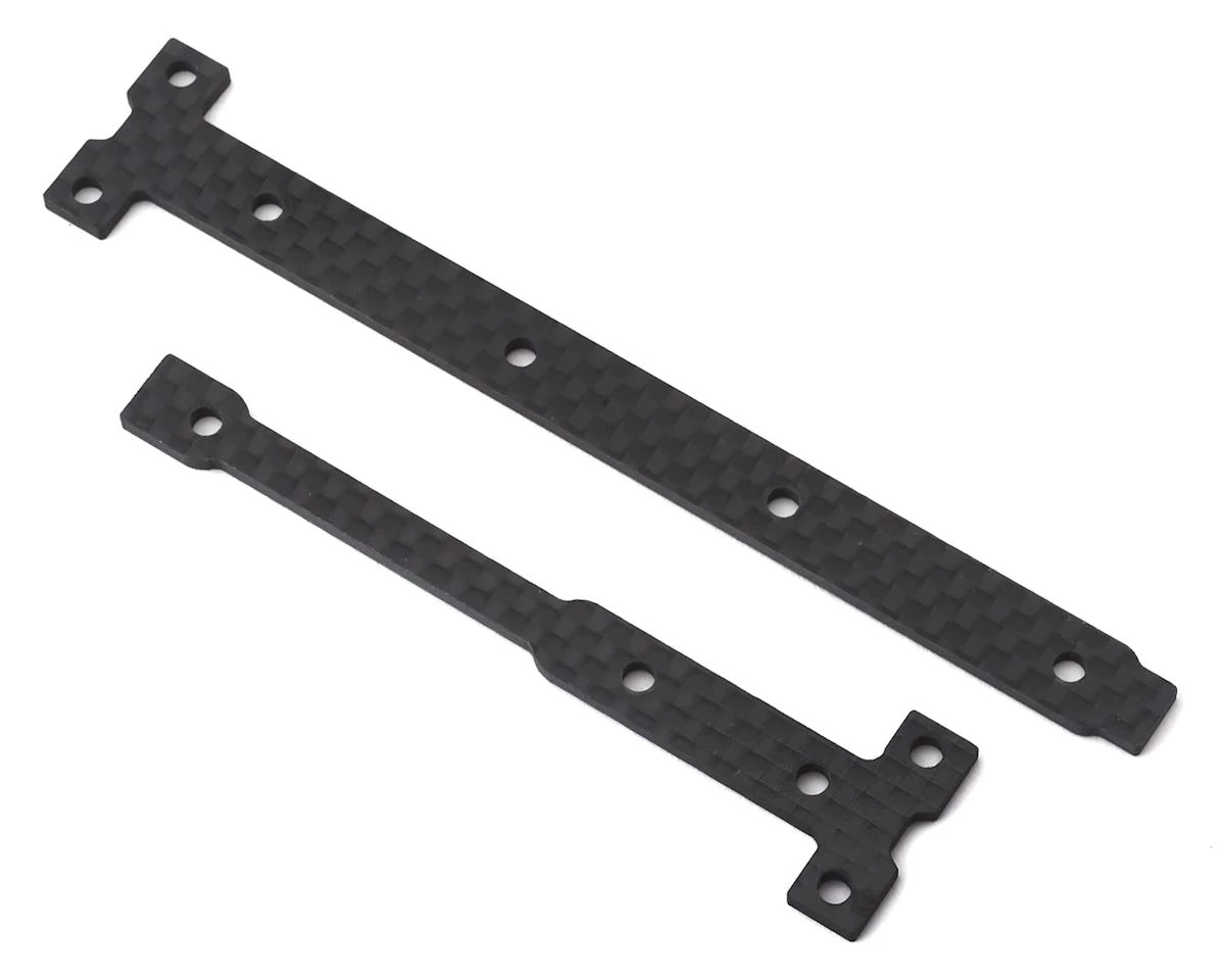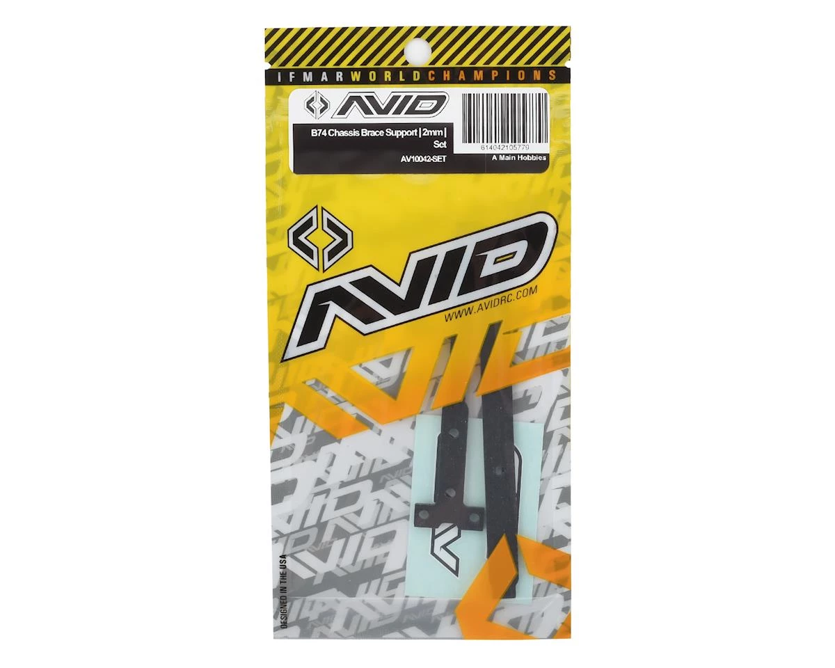This is an Avid RC Carbon Chassis Brace Support Set, intended for use with the Team Associated RC10 B74 Electric Buggy Kit. The Avid B74 Chassis Brace Support Set is 2mm instead of the kit 2.5mm to offer an option to create more traction front and rear.