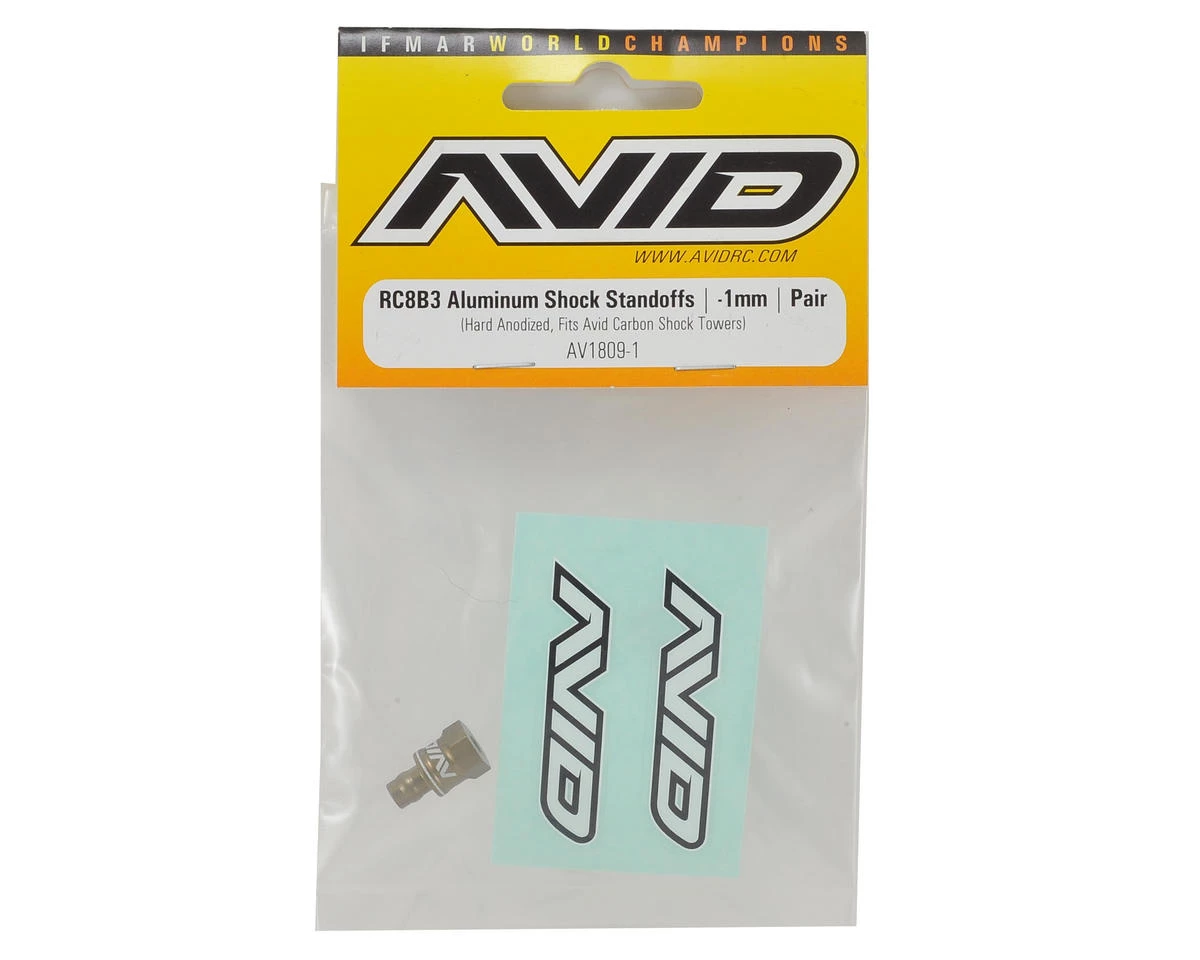 The Avid RC8B3 -1mm Aluminum Shock Standoffs are recommended for RC8B3 buggies equipped with Avid’s Carbon Shock Towers (AVD1808-F & AVD1808-R). These standoffs are 1mm shorter to maintain the stock shock geometry when used with Avid carbon towers. Just like the standard length Avid RC8B3 Aluminum Shock Standoffs, these are machined from 7075-T6 (Hard Anodized for durability), and weigh 50% less than the stock steel standoffs. Package includes two standoffs.