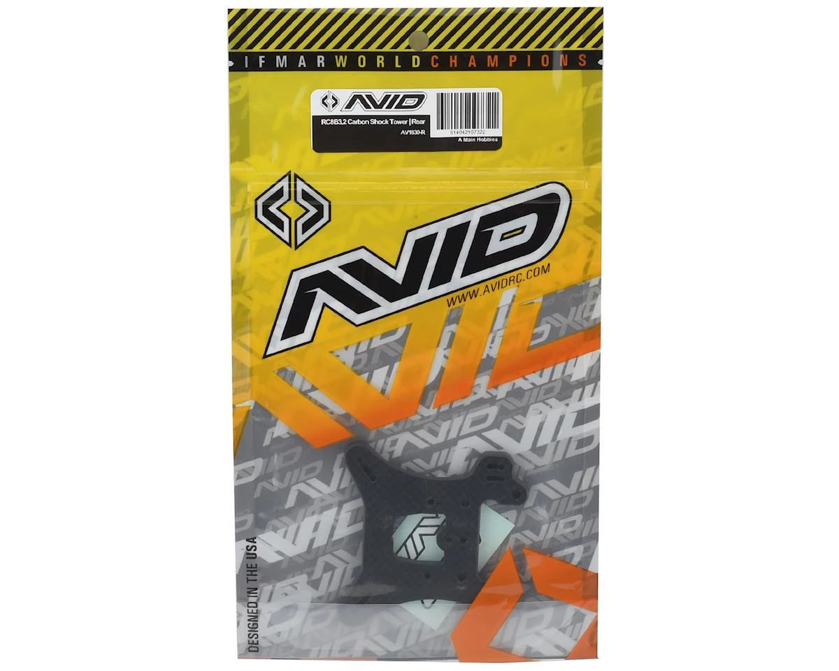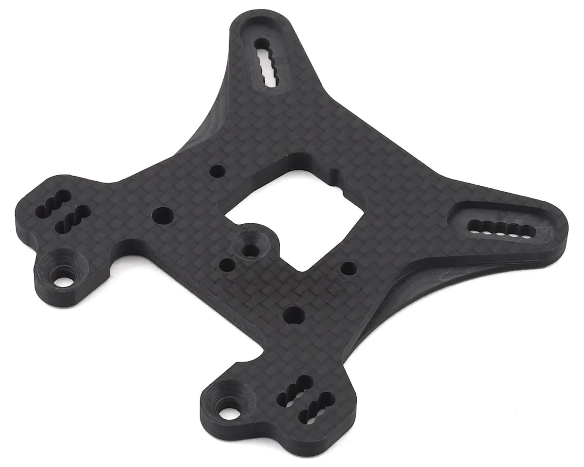 This is an optional Avid RC RC8B3.2 Carbon Rear Shock Tower, cut from 5mm carbon fiber plate with a glossy finish, attractive cut outs and lightly chamfered edges on the front side to better prevent splitting or chipping.