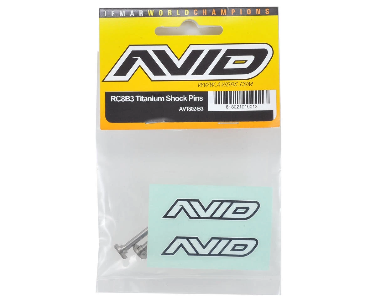 These optional Avid RC RC8B3 Titanium Shock Pins replace the Team Associated Steel Pins (ASC81197) and provide a lightweight and better looking solution for your vehicle. The pins are also machined from 6AL-4V grade 5 Titanium for excellent weight to strength properties.