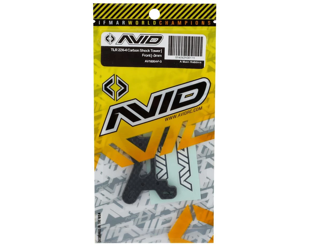 Avid RC TLR 22X-4 Carbon Front Shock Tower. This optional shock tower is made from 100% carbon fiber and lowers the front shocks 3mm. Using this allows for a lower center of gravity on high bite surfaces. The edges are lightly chamfered help prevent splitting and the Avid logo is machined into the upper support. Package includes one front shock tower.