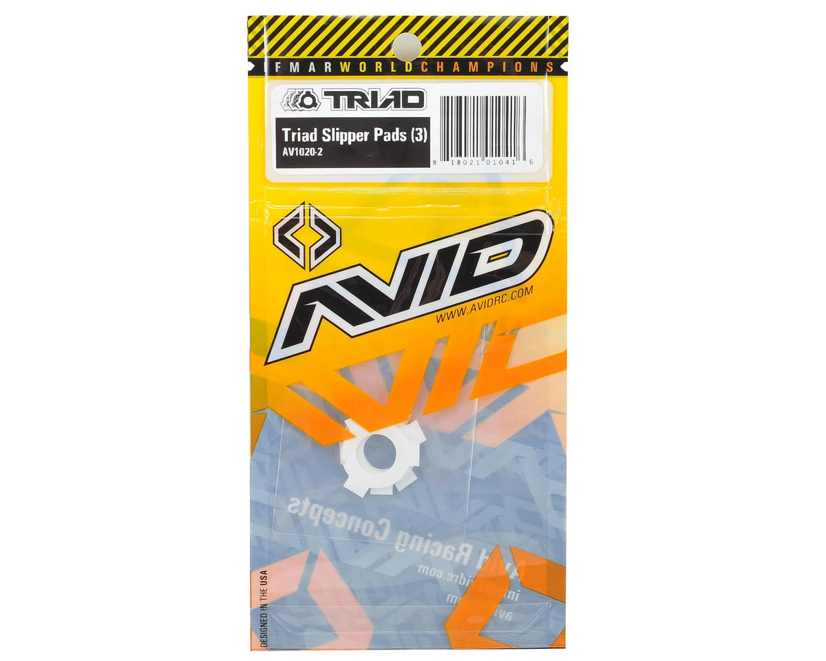 This is a replacement Avid RC Triad Drive Pad Set, and is intended for use with the Associated B4, B44, Sc10 and T4 families of vehicles, as well as the Losi 22, 22T and 22SCT vehicles equipped with the Avid Triad clutch system. The Triad Slipper Clutch utilizes 3 identical pads made out of proprietary virgin PTFE material. These can be used to freshen up your slipper after a long period of use in either your stock or mod Avid Triad Slipper Clutch kit.